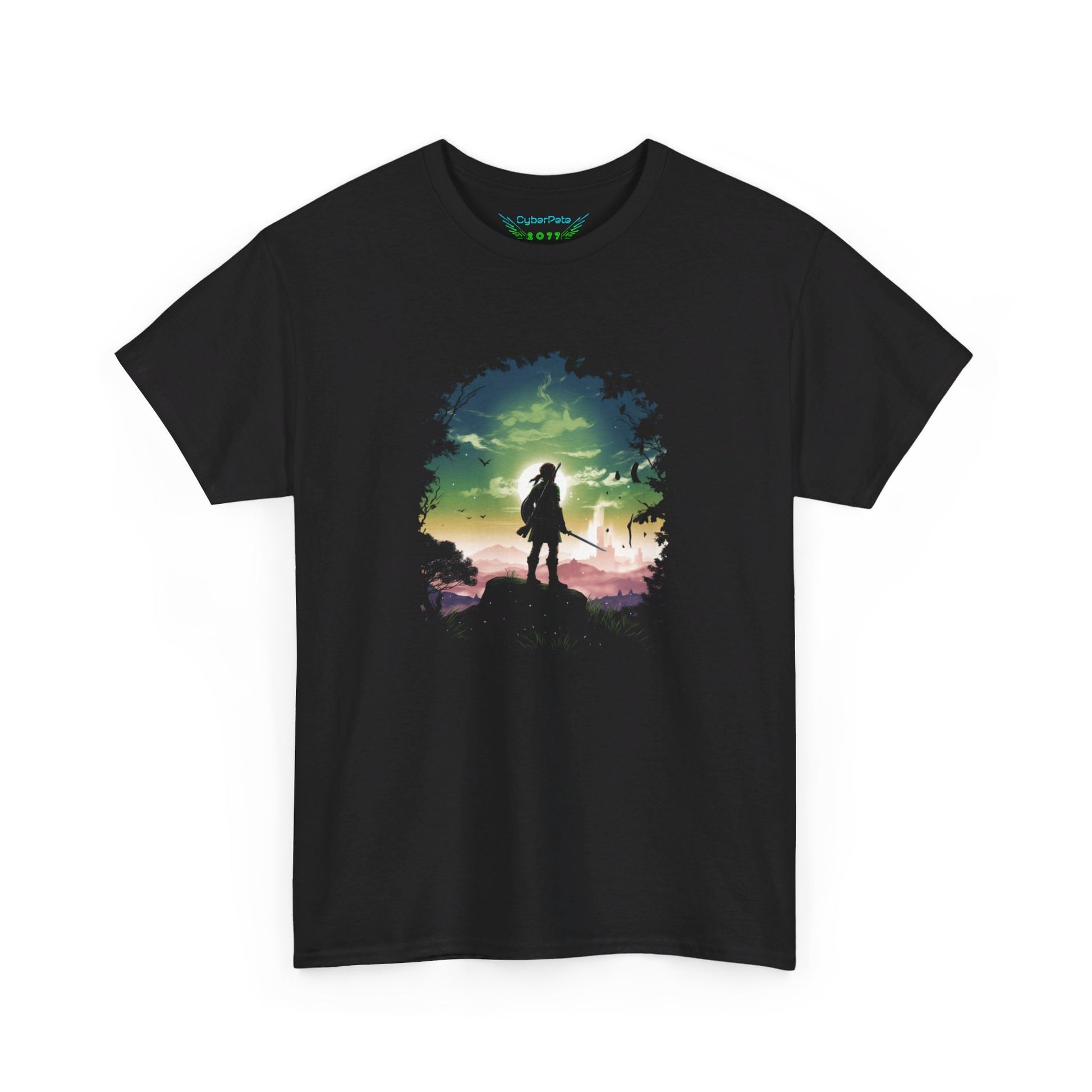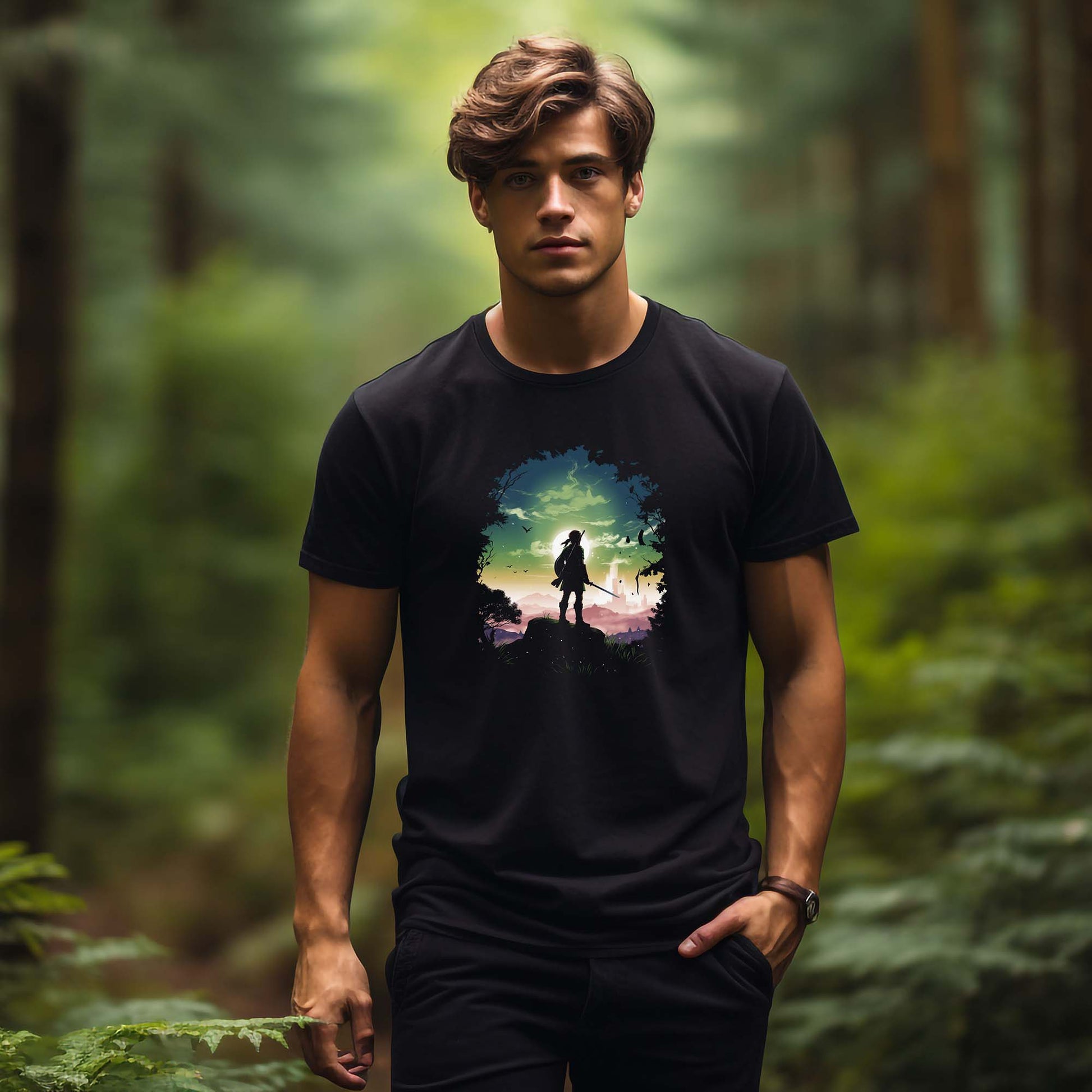 If you are a gamer and a fan of the fantasy genre, then you will love this black pure cotton unisex t-shirt! It's the perfect piece of clothing to show your passion for adventure, fantasy and video games. The large print on the front shows the silhouette of a young adventurer standing in front of a breathtaking fantasy landscape with a sword in hand. This impressive design symbolizes the start of a new adventure and perfectly captures the fascinating world of fantasy.