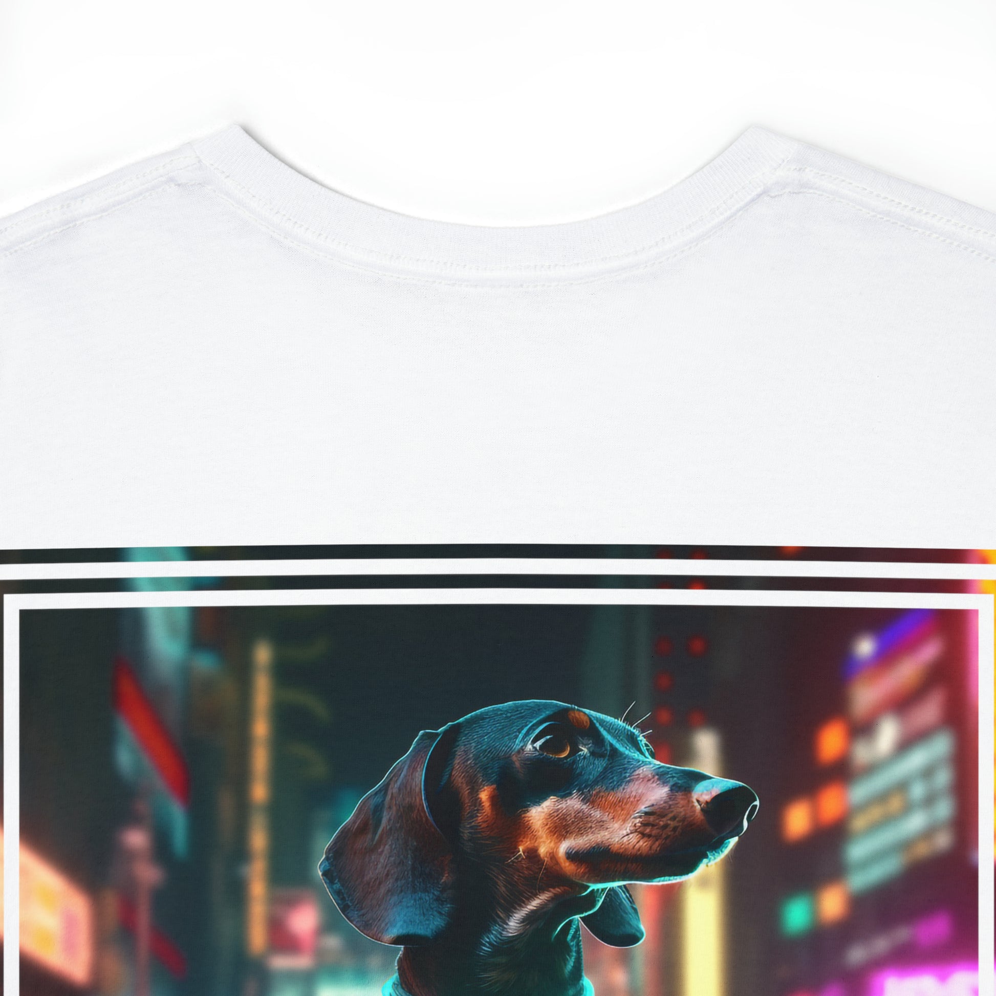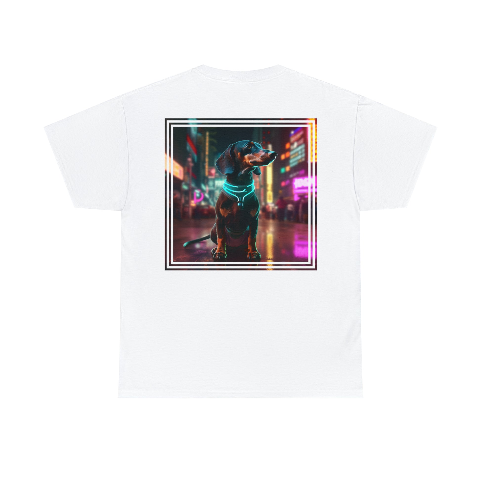 Are you an avid fan of cyberpunk, dachshunds or simply a dog lover? Then my CyberPete2077 Dachshund T-Shirt is just the thing for you! This t-shirt is a statement that expresses your passions in a unique way. This t-shirt features a unique design. On the front you'll find a humorous cartoon logo of a dachshund on the left chest. The highlight awaits you on the back: a dachshund standing in a futuristic cyberpunk city at night with vibrant neon lights. This design attracts attention and will delight you with its originality. The small "CyberPete2077" logo is discreetly placed on the inside of the neck, giving this T-shirt an exclusive touch.
