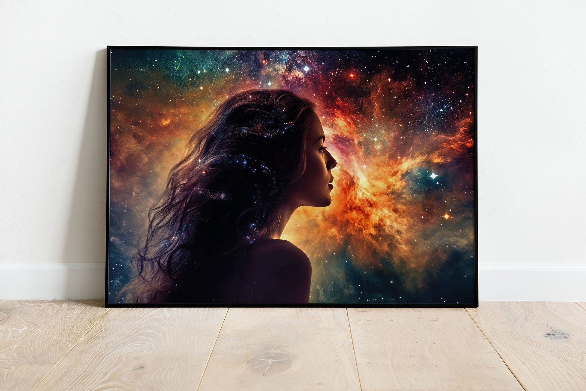 Tauche ein in die faszinierende Welt des Weltraums mit diesem Sternenstaub Schönheit Poster. Dieses horizontale Kunstwerk zeigt das Gesicht einer bezaubernden Frau, deren Haar in funkelnden Sternenstaub übergeht und vor einer farbenfrohen Weltraumszene mit Sternen und Nebeln schwebt. Das Poster fängt die Magie des Weltraums ein und präsentiert eine atemberaubende Weltraumszene mit Sternen und Nebeln, die die Sinne berauscht. Das Gesicht der Frau inmitten dieses kosmischen Meisterwerks verleiht dem Poster eine faszinierende Tiefe und Schönheit.