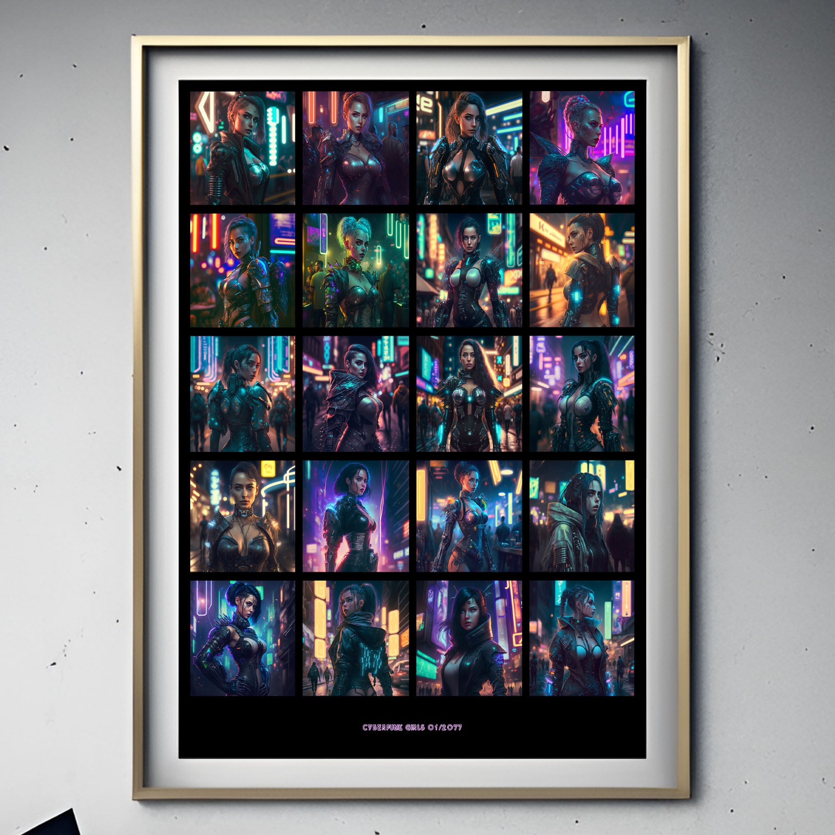 Lass dich von der pulsierenden Ästhetik des Cyberpunk verzaubern mit diesem exklusiven Cyberpunk Street Art Poster Cyberpunk Girls 01/2077! Das Poster ist eine Hommage an die faszinierende Welt futuristischer Städte, wo Neonlicht die Straßen erhellt. Es besteht aus 20 einzelnen Portraits von atemberaubend schönen Frauen im Cyberpunk-Stil, die inmitten der belebten Straßen futuristischer Städte festgehalten wurden. Die Street Art Fotografien ähnlichen Portatis sind in intensives Neonlicht getaucht und durch einen markanten schwarzen Rahmen voneinander getrennt. Dieses einzigartige Design fängt die Essenz des Cyberpunk ein und wird sicherlich jeden Betrachter fesseln.